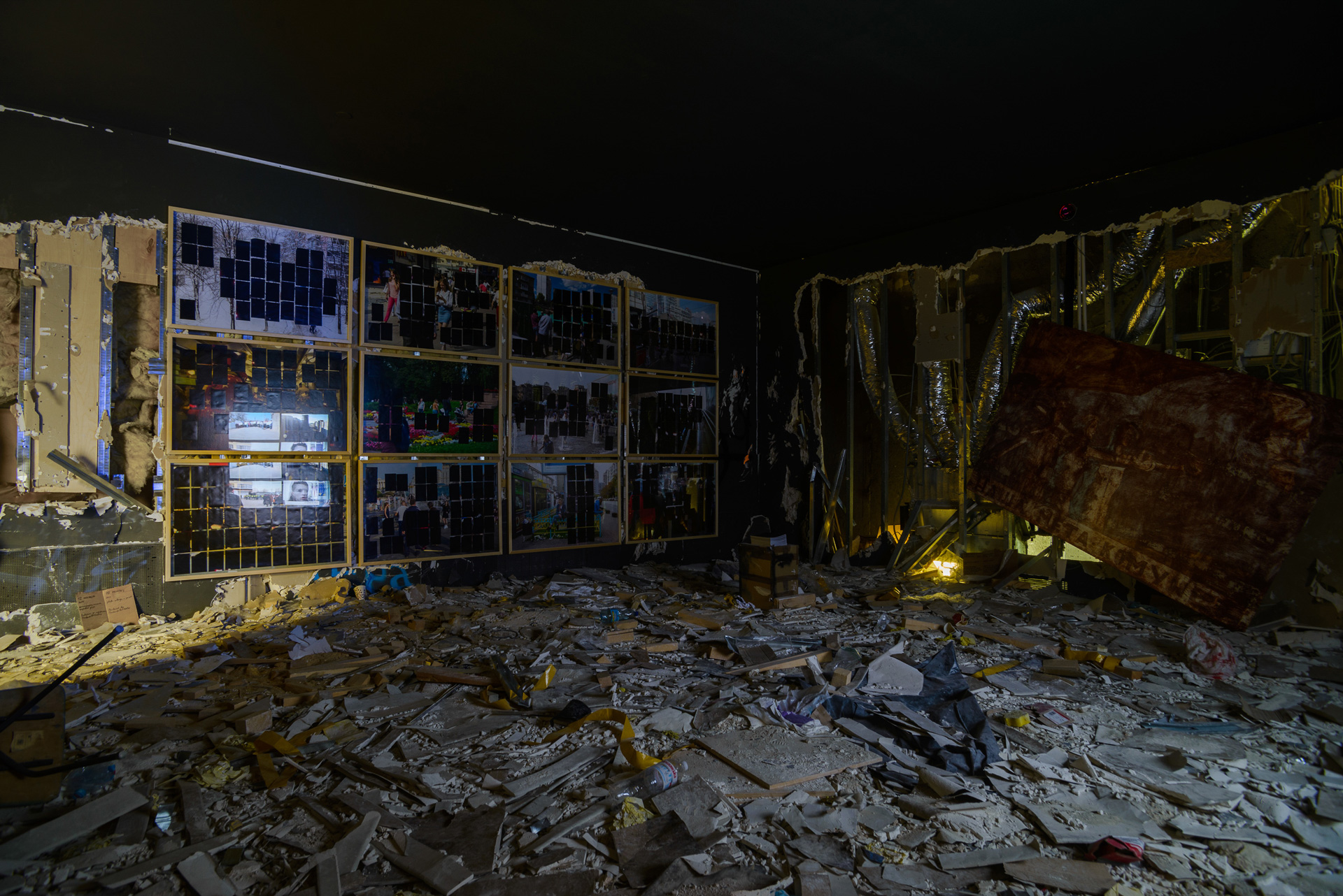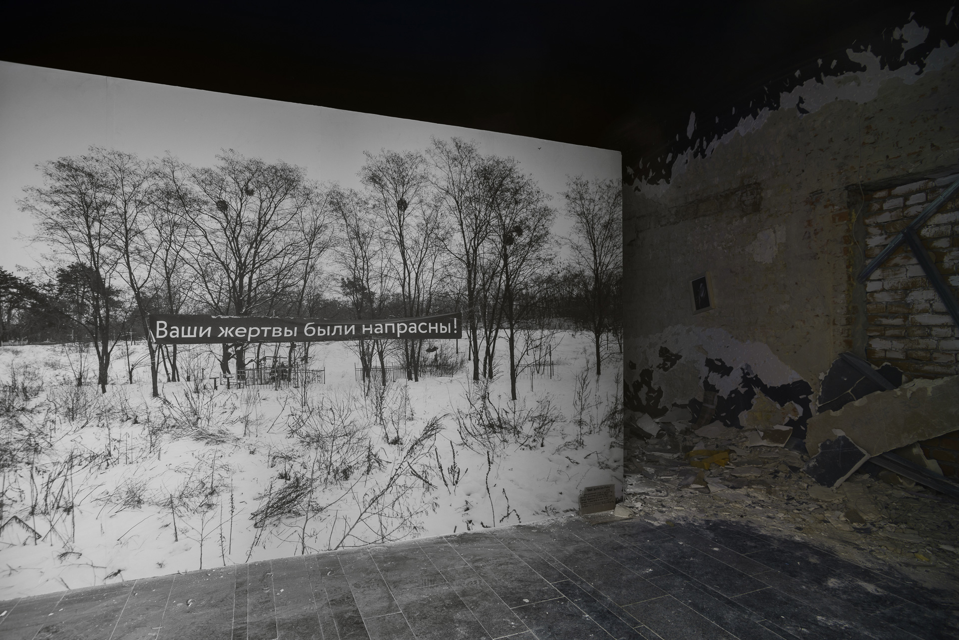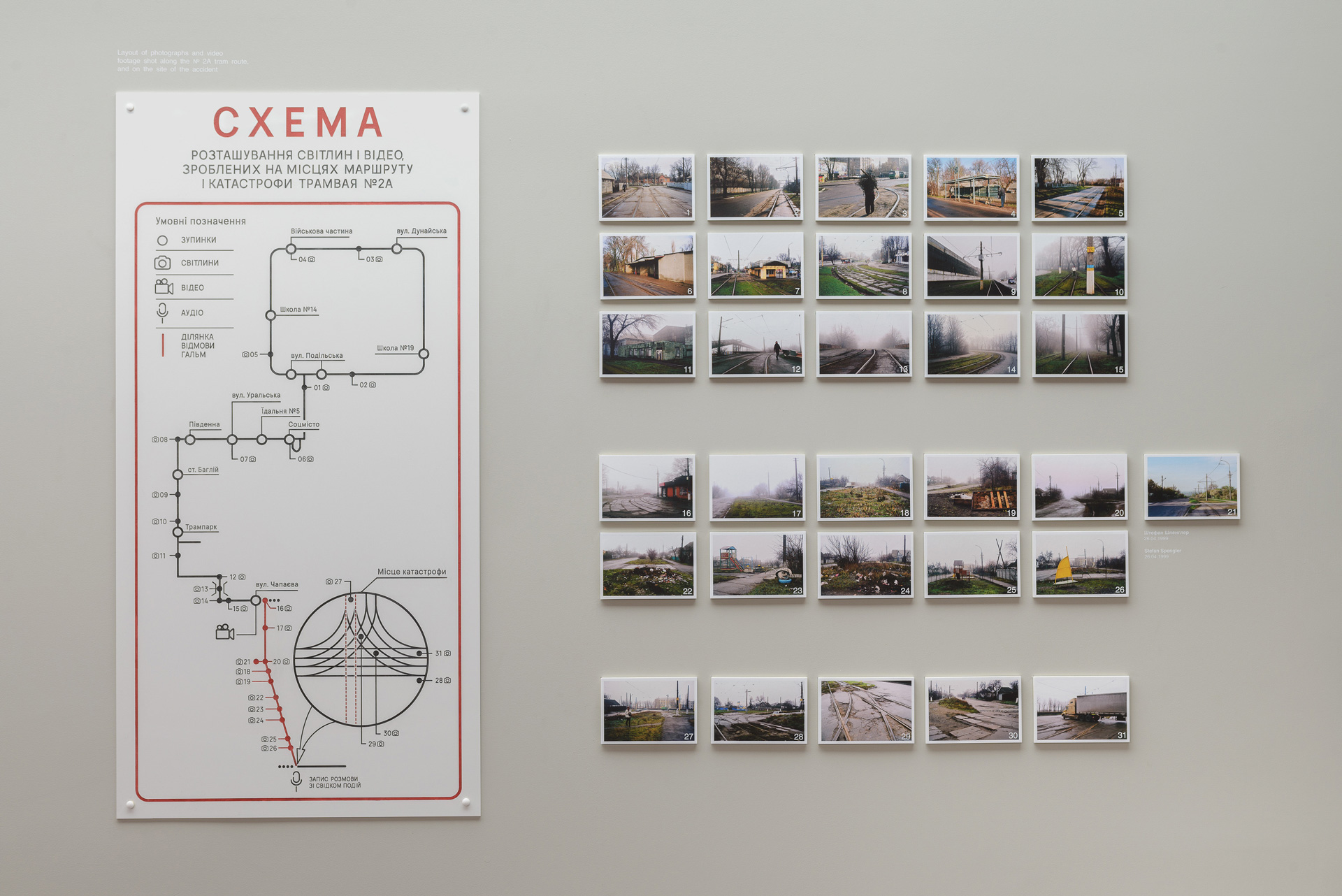 Так, у залі представлено серію фотографій «12 місяців», яка складається з 12-ти робіт, що відображають щомісячну хронологію втрат українських військових на сході України впродовж 2017 року. В експозиції її поєднано з фотографією знищеного пано «Наша мета — комунізм» на стіні загальноосвітньої школи в селі Володькова Дівиця (раніше — Червоні Партизани) на Чернігівщині, 4-х канальним відеоколажем «Надзвичайний стан», утвореного зі знайдених та авторських відео, та закільцьованим відео «Мені більше не сняться сни».